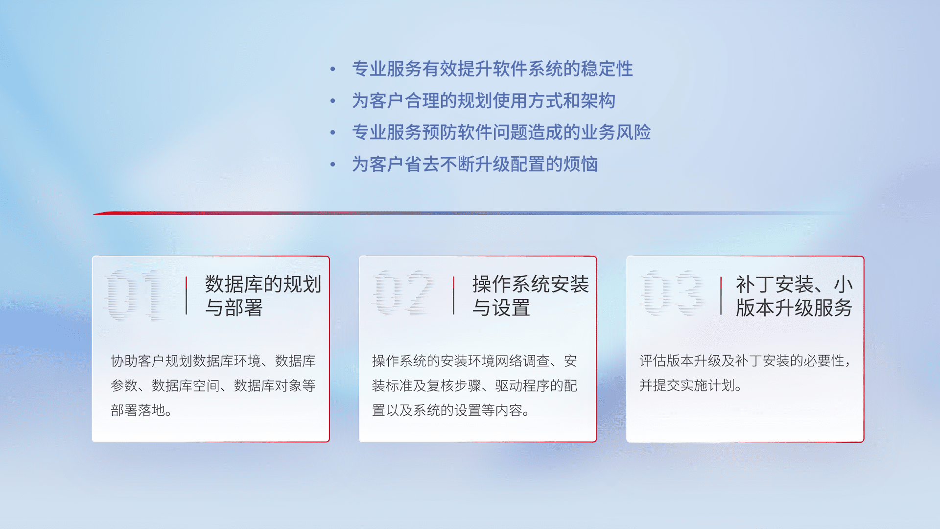 为客户提供软件规模升级、、快速部署、、、、按需配置的专业服务,,从数据库的规划与部署到操作系统的安装与设置,,,,再到补丁安装和小版本升级提供支持。。。。
